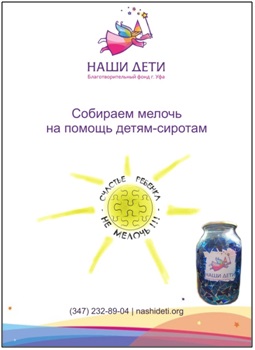 СЧАСТЬЕ ребенка – НЕ мелочь – СДЕЛАЕМ МИР ЛУЧШЕ! Сотрудничая с Фондом «Наши дети» - http://www.nashideti.org/about/ - на постоянной основе, мы с удовольствием поддерживаем их акции – как постоянно актуальные – например – Сухая попа http://www.airrb.ru/blagotvoritelnost/9438/, так и краткосрочные, но полезные. Все программы фонда – http://www.nashideti.org/programs/ - ПРИСОЕДИНЯЙТЕСЬ – в любое время! А сейчас приглашаем ВСЕХ принять участие в новой акции – чтобы помочь детям-сиротам, а также тем ребятам, кто РЕАЛЬНО остался сиротой, хотя ЮРИДИЧЕСКИ у него есть родители - просто они своего ребенка «забыли» … в больнице. Подробнее о программе «Больничные дети» – http://www.nashideti.org/programs/programs.php?ELEMENT_ID=20 Суть НОВОЙ акции очень проста: дать людям возможность всю завалявшуюся в карманах и/или кошельках мелочь сложить в одну копилку, чтобы на полученные деньги помочь детям, оставшимся без попечения родителей. Механизм акции: сбор пожертвований в 2-х литровые стеклянные банки, закрытые металлическими (для консервирования) крышками с прорезью и разрисованные усилиями детей и волонтеров. Сроки акции: с 31 мая по 31 августа 2013 года Описание акции: 1. Банка и плакат выдаётся ответственному лицу благотворительным фондом «Наши Дети» г. Уфа, по адресу ул. Лесотехникума 53, к 23, или доставляется в пункт размещения по предварительной договоренности. 2. Банка размещается в офисе компании или в кассовой зоне, в свободном доступе. Назначается ответственный из числа сотрудников, который контролирует сохранность банки и денег в ней. 3. Всем сотрудникам презентуется акция в любом удобном формате: корпоративная почта, брифинг, объявление, плакат, который предоставит фонд «Наши Дети» и т.д. 4. После завершения акции, или по мере заполнения – но не позже 31 августа 2013 года, банка привозится в офис фонда «Наши Дети», по окончании акции все деньги пересчитываются и перечисляются на программу «Больничные дети». ВЫБЕРИТЕ свой способ стать участником: 1. Получите банку и плакат в благотворительном фонде «Наши Дети» г. Уфа, по адресу ул. Лесотехникума 53, к 23, или договоритесь с представителем фонда о его доставке в Ваш офис. 2. Перечислите денежные средства в благотворительный фонд, указав в квитанции в графе "Назначение платежа" "Благотворительное пожертвование на программу "Больничные дети"