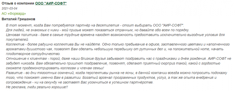 Отзыв о компании ООО "АИР-СОФТ" от АО "ТехноИнвест" на сайте Dr. Web
